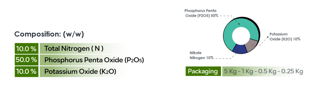 A highly concentrated powder fertilizer containing molybdenum and boron, enriched with soluble phosphorus. It has a synergistic effect, stimulating flowering and fruit set, thus improving growth. It also addresses nutrient deficiencies, prevents health problems, and improves crop yields. Both boron and molybdenum are essential for forced-flowering crops, where the fruit set and growth phases overlap.