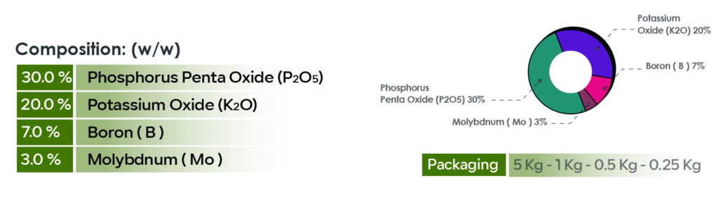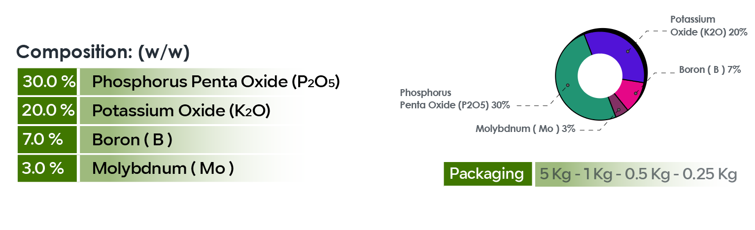 تركيبة متطورة عالية الفسفور والبوتاسيوم لتعزيز إنتاج الطاقة (ATP) الضرورية لانقسام الخلايا وتكوين الأزهار والعقد. و لتحسين نقل السكريات وزيادة جودة وحجم الثمار