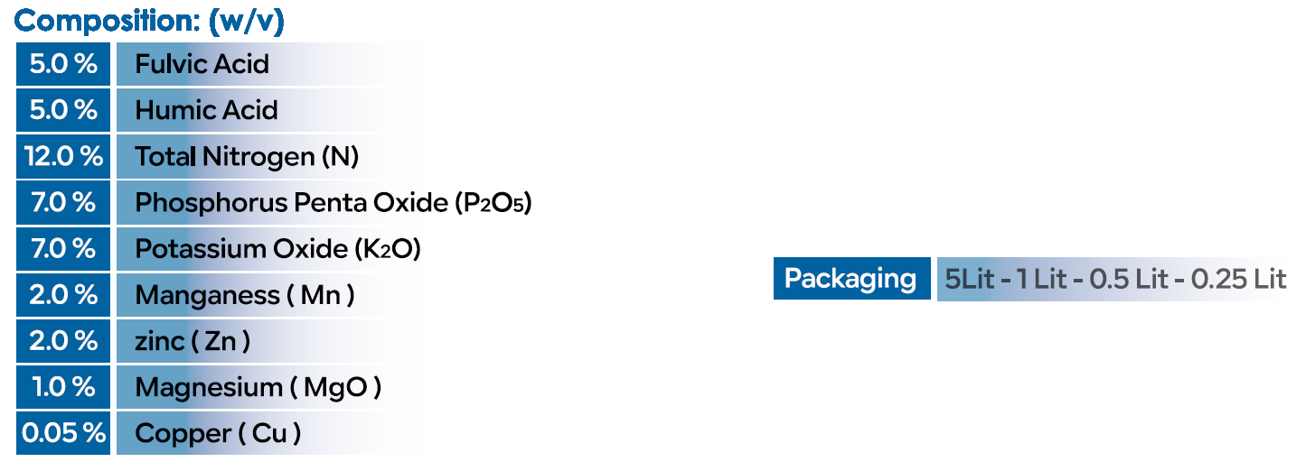 تركيبة مطورة تحتوي على الاحماض العضوية على شكل (هيومك اسيد وفولفيك اسيد) بالإضافة الى العناصر الغذائية الكبرى (نيتروجين – فسفور – بوتاسيوم) والعناصر الغذائية الصغرى (منفنيز – زنك-مغنيسيوم-نحاس) الضرورية لتنشيط البراعم الطرفية وتحفيز أعادة بناء النمو الخضري للنبات
